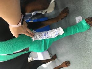 Several dressing changes with the “donut” used to protect the point of the elbow and a splint on the front of the elbow to temporarily reduce flexion, and about 3 weeks later the wound was solid enough to leave open to the air.